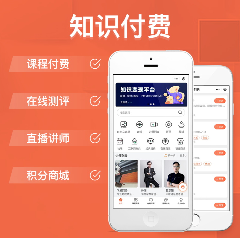 | 系统功能: | ①课程付费:课程分类、直播授课、直播回放、视频课程、图文课程;②考试测试:计时测试、在线答题、错题回顾、考试真题、考试训练:③直播讲师:讲师列表、课程专栏、课程购买、课程赠送;④营销模块:推广分销、签到打卡、会员中心、拼团课程、在线送礼 |